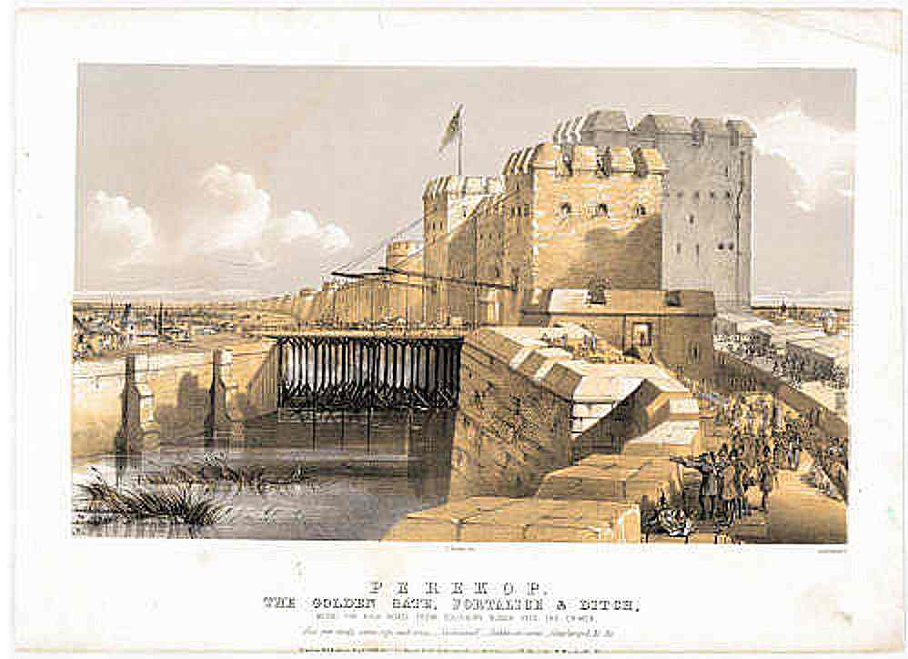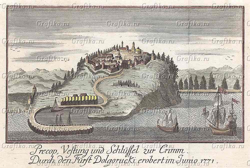 представлена старинная гравюра, изображающая Перекоп эпохи 1736-1771 годов. Прорытый Перекопский канал-ров показан как широкая водная артерия, отделяющая Крым от материка. ПО КАНАЛУ ПЛЫВУТ КОРАБЛИ.
