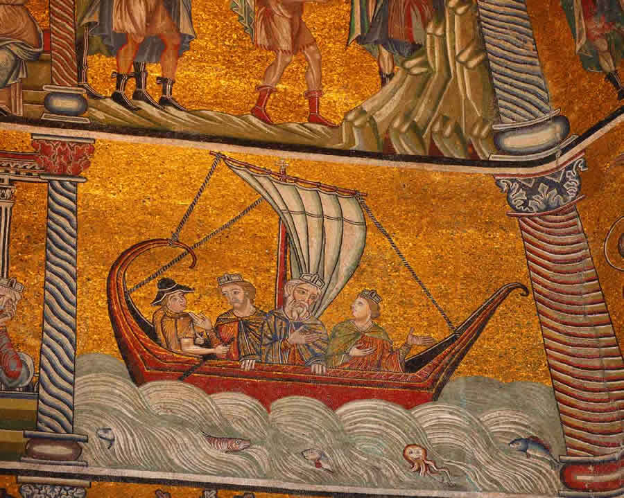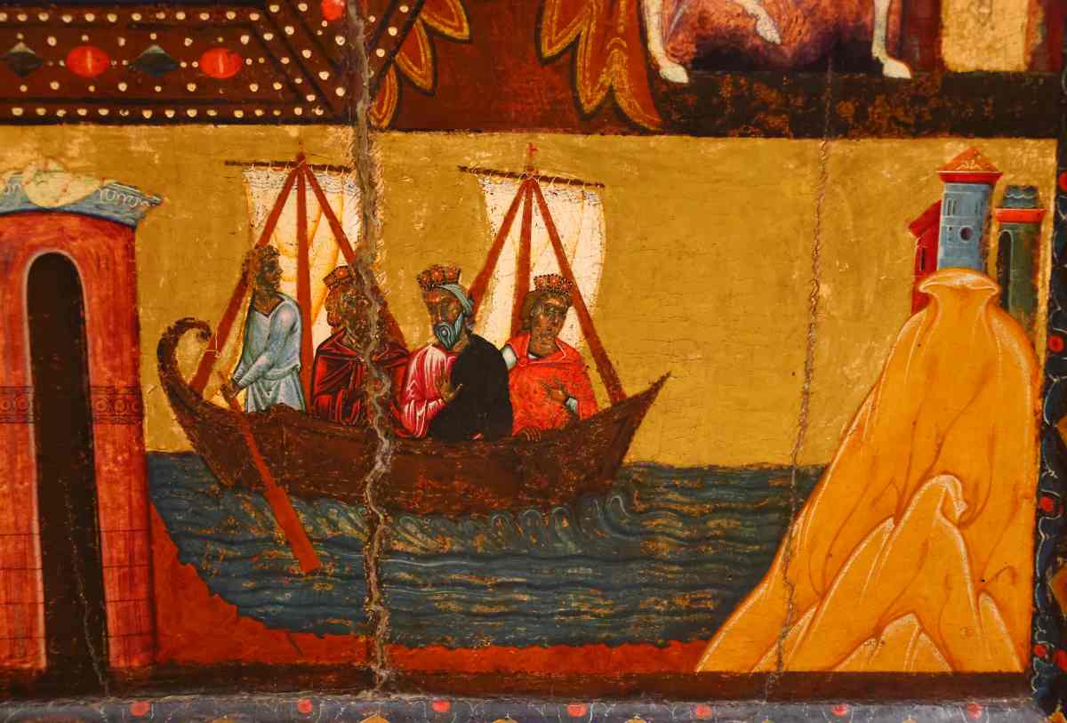 . Слева на корабле сидит рулевой или гребец с веслом или длинным рулем. На нем нет короны. Перед ним справа расположены трое Волхвов в царских коронах.