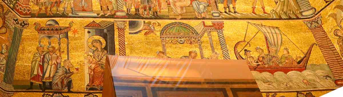 . Ангел сообщает трем Волхвам о Рождении Иисуса (клеймо слева). Затем мы видим, как Волхвы на конях отправляются на поклонение к Иисусу. В центре нижнего ряда показаны три евангельских Волхва. Справа в нижнем ряду показано, как они ПЛЫВУТ В КОРАБЛЕ через море. Слева внизу мы видим поклонение Волхвов, они подносят дары Младенцу Христу. Порядок событий несколько нарушен художником, но все основные сюжеты истории Волхвов аккуратно представлены.