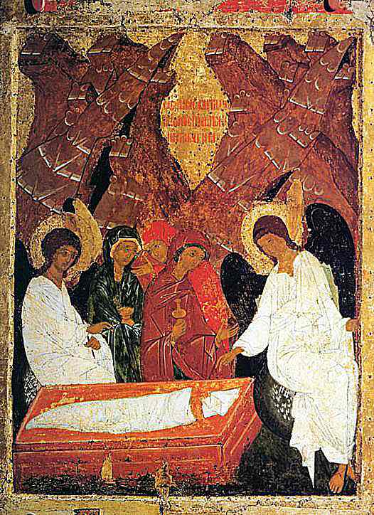 Напомним, что о Вознесении Иисуса возвестил Ангел, которого увидели жены-мироносицы, явившиеся утром к гробнице Христа. Ангел сидит у пустого гроба Иисуса. Существует множество икон, представляющих жен-мироносиц и Ангела у Гроба Господня, где остались лежать лишь пелены, окутывавшие тело Христа, рис.2.26