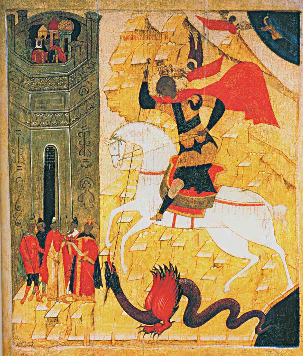 Обратите внимание, что персидское Сказание считает, будто конь Георгия (обратившись в змея) погибает в сражении со страшным черным змеем, то есть с драконом-медведем. На первый взгляд это непонятно. Ведь в традиционных рассказах о битве Георгия ничего такого не сообщается. Оказывается, ответ очень интересен. Поскольку Георгий Победоносец - Иосиф - Исаак является одним из центральных персонажей русской истории, то естественно обратиться именно к старым русским Сказаниям на эту тему. И тогда мы обнаруживаем интересный сюжет, о котором уже подробно говорили в книге "Курган Христа и Богородицы.