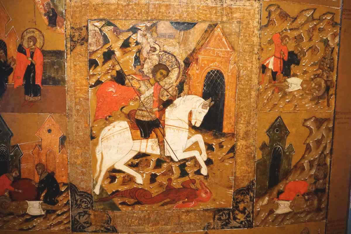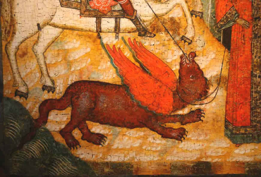 . Иконописец еще помнил, что на самом деле УБИТ БЫЛ МЕДВЕДЬ, но под давлением внедряемой "новой традиции", был вынужден приделать ему длинный змееобразный хвост, дабы медведь стал хоть немного похожим на змия.