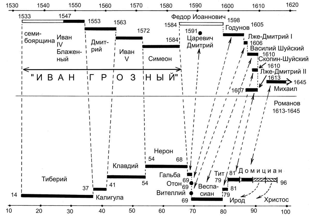 Иосиф Флавий рассказывает о правлении античного римского императора Тиберия, то есть, как мы показали ранее, о правлении Ивана Грозного из XVI века. В то же время Флавий вплетает в свое повествование рассказы об Иисусе Христе, Иоанне Крестителе, царе Ироде и прокураторе Пилате. То есть сообщает, как мы теперь понимаем, о персонажах второй половины XII века. Итак, у Флавия совместились события двух эпох, отличающихся примерно на триста лет. Такова, кстати, величина "римского сдвига дат", открытого А.Т.Фоменко, см. ГХК на рис.3.47